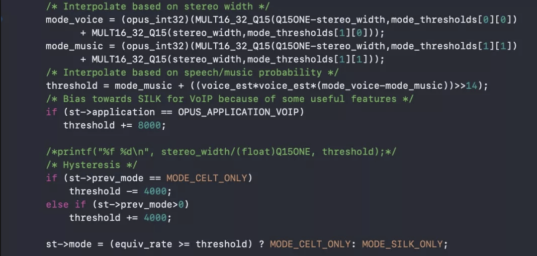 Opus 是由 SILK+CELT 混合的编码器,学术上的叫法叫做 USAC,Unify Speech and Audio Coding,不区分音乐语音的编解码器。这个编解码器内有个 Music detector 去判断当前帧是语音还是音乐,语音选择 silk 框架编码,音乐选择 celt 框架编码,通常建议不限制编码器固定采用哪种模式编码。