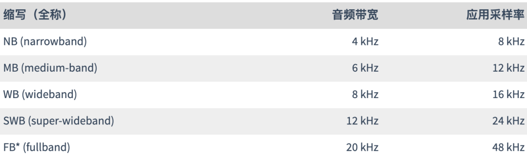采样率从8 kHz(窄带)到48 kHz(全频)