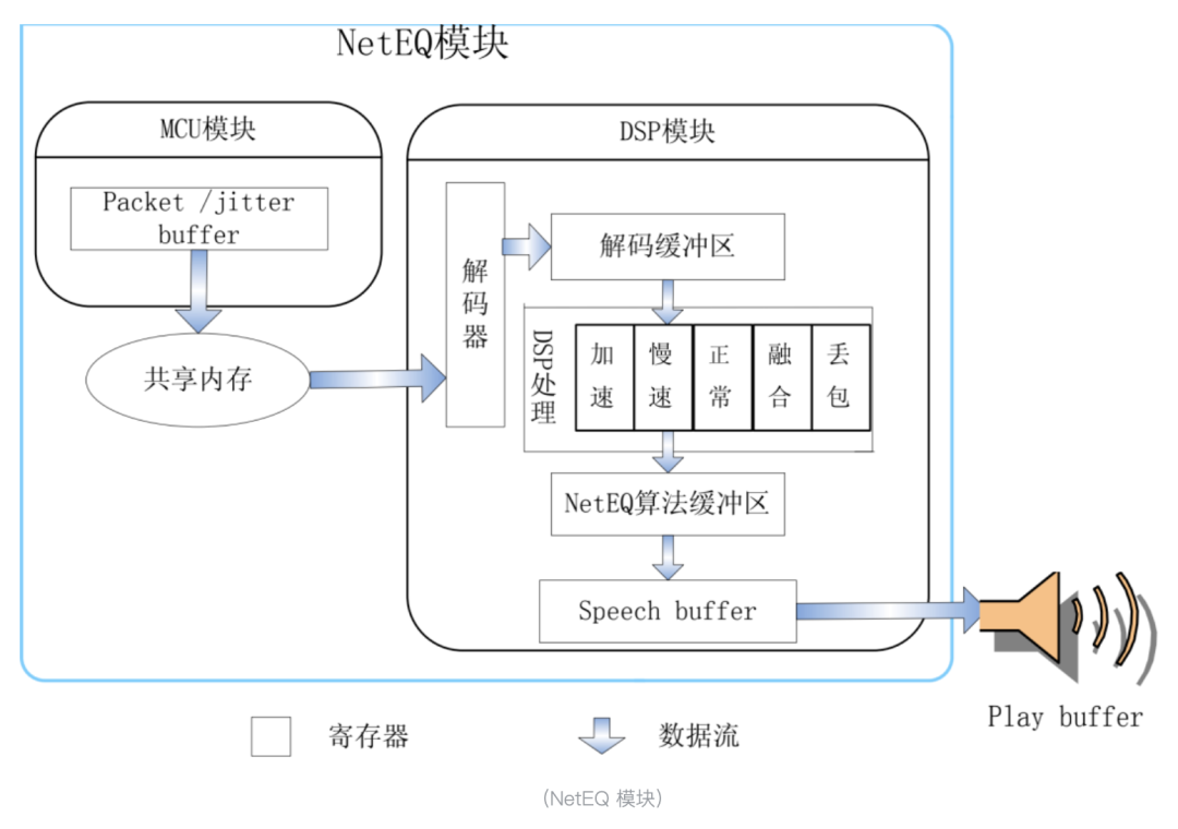 NetEQ 核心模块有 MCU 模块和DSP 模块,MCU 模块负责往 jitter buffer 缓存中插入数据和取数据,以及给 DSP 的操作;DSP模块负责语音信息号的处理,包括解码、加速、减速、融合、PLC 等。同时 MCU 模块从 jitter buffer 中取包受到 DSP 模块相关反馈影响。MCU 模块包括音频包进入到 buffer,音频包从 buffer 中取出,通过语音包到达间隔评估网络传输时间延时,以及对 DSP 模块执行何种操作(加速、减速、PLC、merge)等。DSP 模块包括解码,对解码后的语音 PCM 数据进行相关操作,评估网络抖动 level,向 play buffer 传递可播放的数据等等。