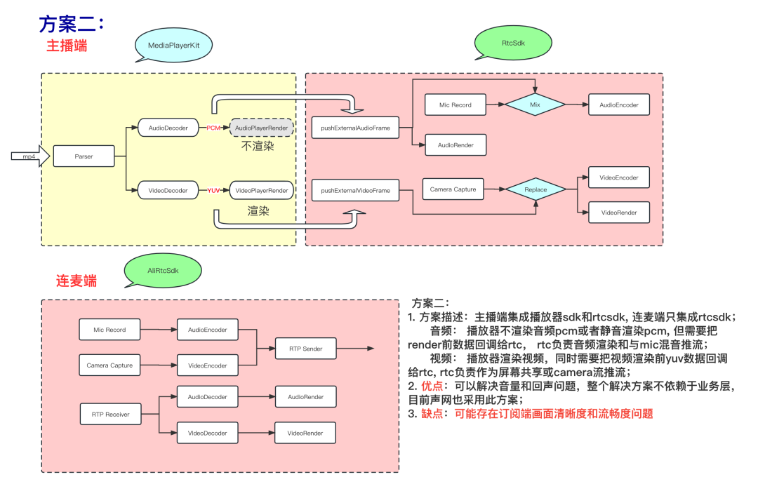 方案三更进一步的演进方案,也可以通过rtc的信令通道,将主播的播放进度操作同步到连麦端,从而做到播放进度同步,业务层逻辑可以做到最简化,性能也可以做到最优。