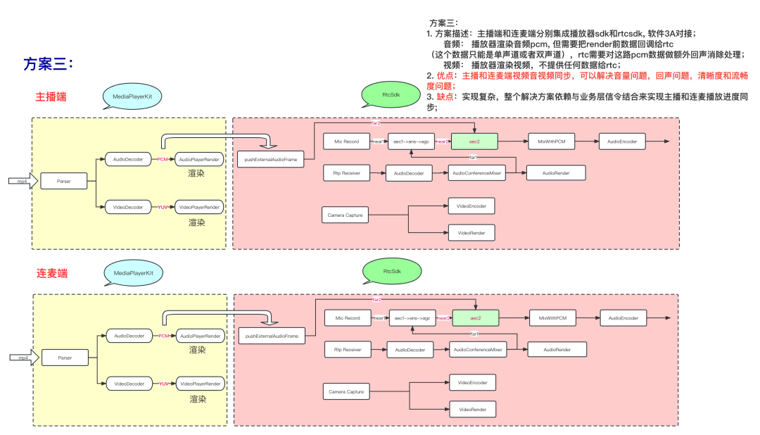 方案二:方案二和方案三的核心思想,就是拿到播放器渲染前的音频参考信号,送给软件aec做远端参考信号做回声消除,从而消除回声;并且方案二和方案三都可以统一使用媒体音量条,rtc都用纯软3A的方案接入,可以很好的解决方案一中的三个体验问题。