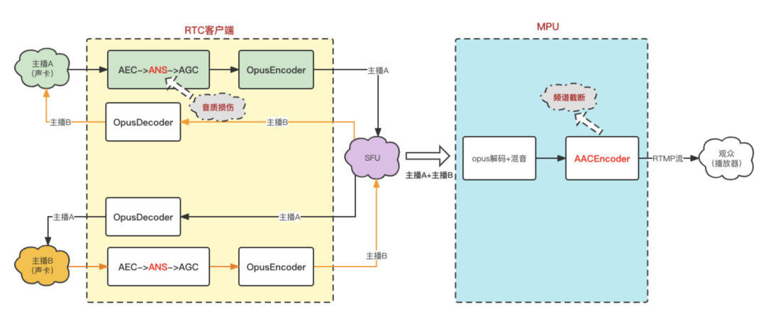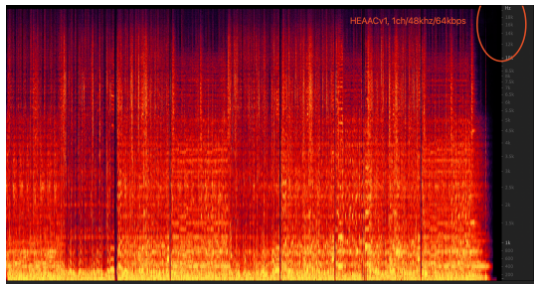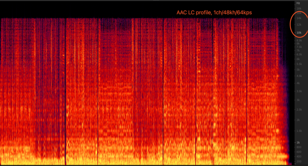 服务端侧:mpu在拉到两个主播的流混音后转码为AAC流的过程中,设置的AAC Audioprofile参数是LC, 64kbps,1ch;这组参数的码率下会导致AAC的频宽只有16kHz, 也就是频谱截断。输入为单声道、48000的音频、码率为64kbps的情况下,AAC LC模式从频宽和听感上相较于AAC HEv1/HEv2模式都要差。