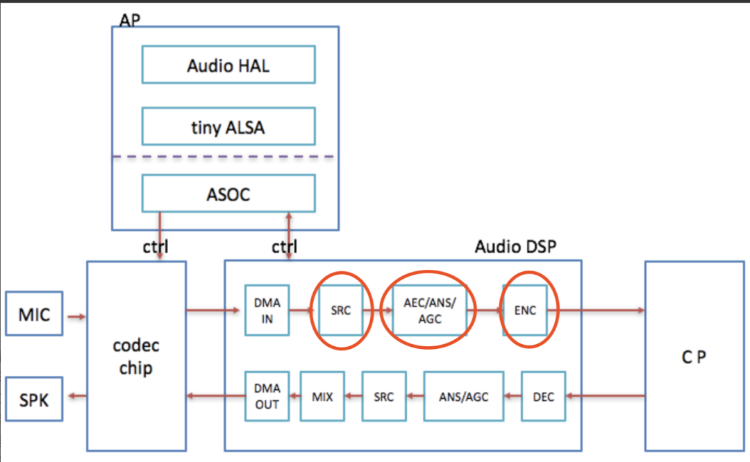 原因:高通芯片为例,SRC在AudioDSP内部,voip模式下, enc是可选的,前面的SRC会降采样到16khz,audiodsp再升采样到48khz,给到AP层是48khz数据;MTK芯片的SRC逻辑在AudioDSP外面;核心原因在与硬件3A只支持16khz, 一方面是出于dsp功耗考虑(aec算法复杂度比较高),另一方面是由于voip的语音编码通常只支持8khz/16khz语音编码;