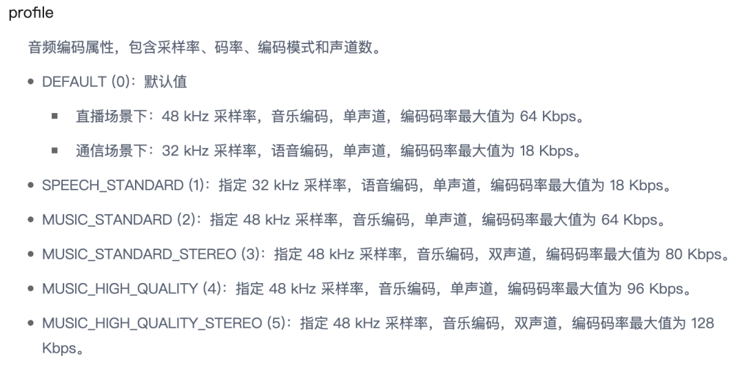 为了一套 sdk满足不同业务场景下的不同音质需求,rtc厂商会提供不同的AudioProfile来做区分给用户提供设置,详见附录二。