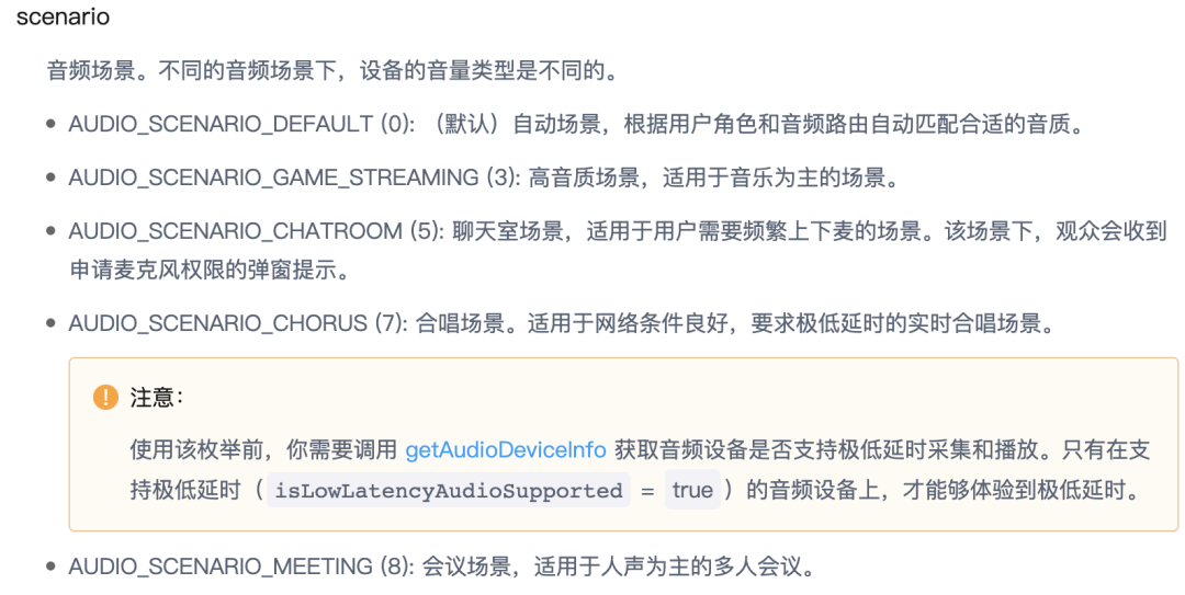 场景模式(scenario)会影响音频设备参数,软件3A策略以及相关的Qos策略等,与编码码率无关;不同的场景模式,对音频数据的处理侧重点不同,以及对应不同的音量条,需要根据不同的业务场景和对音质和相关技术指标不同来做选型。