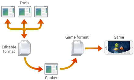 对于许多游戏引擎来说,游戏内容以各种可编辑的格式创建,例如.png,.json,.blend或专有格式,然后最终转换为特定于平台的可以快速加载到引擎的游戏格式。流水线中的最后一个应用通常被称为“炊具”。炊具可能被集成到另一个工具,甚至分布在几台机器上。通常,炊具和一些工具是与游戏引擎本身一起开发和维护的。