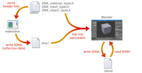 从源代码构建Blender时,有许多步骤。首先,编译并运行一个名为makesdna的自定义实用程序。该实用程序解析Blender源代码树中的一组C语言头文件,然后以SDNA的自定义格式输出所有C定义类型的汇总。这个SDNA数据作为反射数据,链接到Blender本身,并保存在Blender写入的每个.blend文件中。从这一刻开始,每当Blender加载一个.blend文件,就会将.blend文件的SDNA与链接到当前版本的SDNA进行比较,并使用通用序列化代码来处理差异。这个策略使Blender具有令人印象深刻的向前和向后兼容性。你仍然可以在最新版本的Blender中加载1.0版本的文件,也可以在旧版本中加载新的.blend文件。