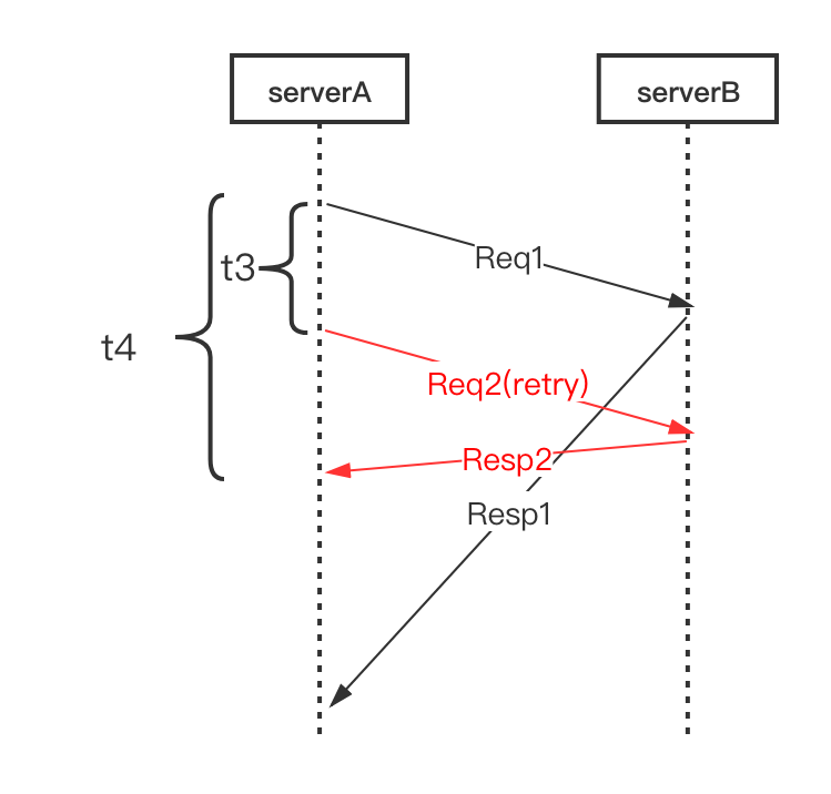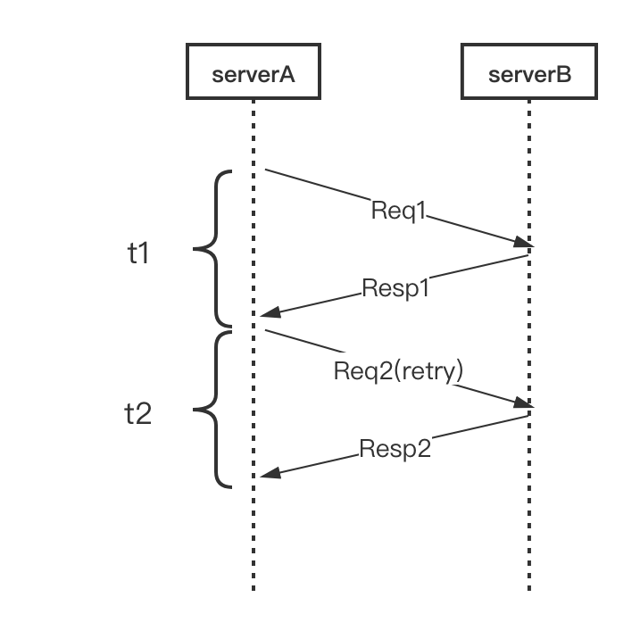如下图,正常重试的场景是等拿到 Resp1 (或者拿到超时结果) 后再发起第二次请求,整体耗时是 t1 + t2 。我们分析下,service A 在发出去 Req1 之后可能等待很长的时间,比如 1s ,但是这个请求的 pct99 或者 pct999 可能通常只有 100ms 以内,如果超过了 100ms,有很大概率是这次访问最终会超时,能不能不要傻等,而是提前重试呢?