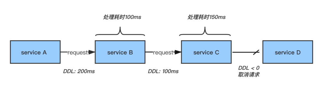 DDL 是“ Deadline Request 调用链超时”的简称,我们知道 TCP/IP 协议中的 TTL 用于判断数据包在网络中的时间是否太长而应被丢弃,DDL 与之类似,它是一种全链路式的调用超时,可以用来判断当前的 RPC 请求是否还需要继续下去。如下图,字节跳动的基础团队已经实现了 DDL 功能,在 RPC 请求调用链中会带上超时时间,并且每经过一层就减去该层处理的时间,如果剩下的时间已经小于等于 0 ,则可以不需要再请求下游,直接返回失败即可。