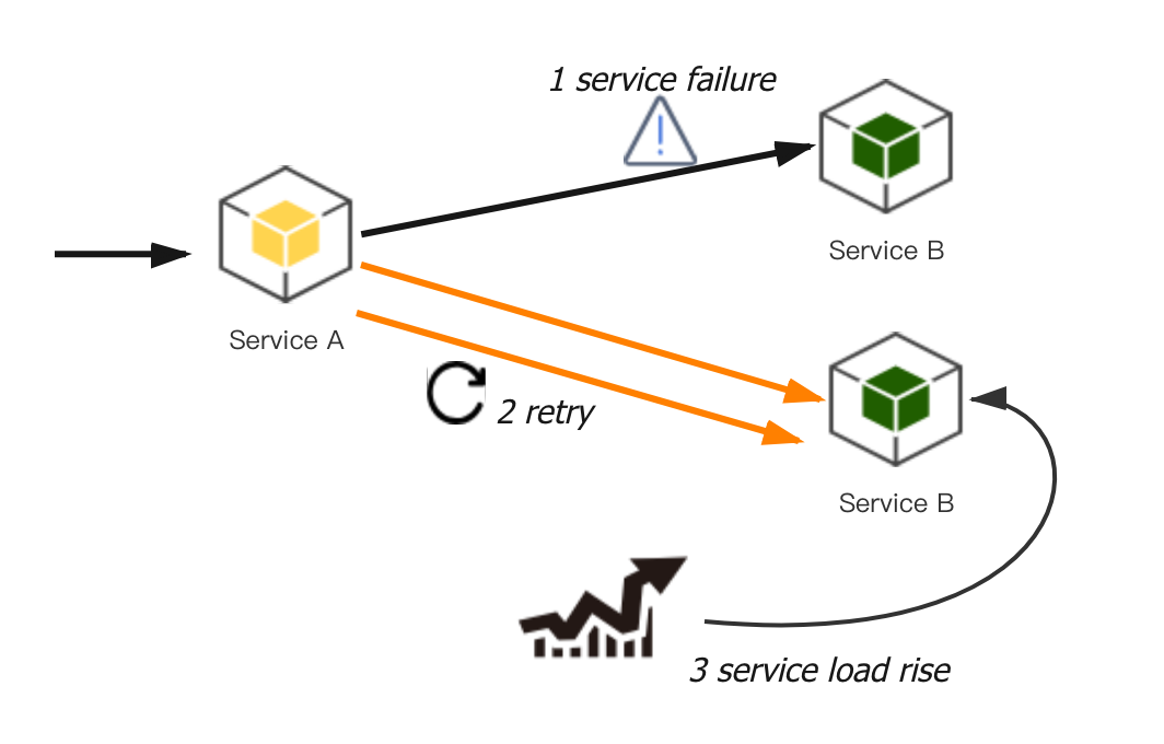 假设现在场景是 Backend A 调用 Backend B,Backend B 调用 DB Frontend,均设置重试次数为 3 。如果 Backend B 调用 DB Frontend,请求 3 次都失败了,这时 Backend B 会给 Backend A 返回失败。但是 Backend A 也有重试的逻辑,Backend A 重试 Backend B 三次,每一次 Backend B 都会请求 DB Frontend 3 次,这样算起来,DB Frontend 就会被请求了 9 次,实际是指数级扩大。假设正常访问量是 n,链路一共有 m 层,每层重试次数为 r,则最后一层受到的访问量最大,为 n * r ^ (m - 1) 。这种指数放大的效应很可怕,可能导致链路上多层都被打挂,整个系统雪崩。