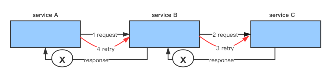 对于 A -> B -> C 的场景,假设 B -> C 超时,B 重试请求 C ,这时候很可能 A -> B 也超时了,所以 A 没有拿到 B返回的错误码,而是也会重试 B , 这个时候虽然 B 重试 C 且生成了重试失败的错误码,但是却不能再传递给 A 。这种情况下,A 还是会重试 B,如果链路中每一层都超时,那么还是会出现链路指数扩大的效应。