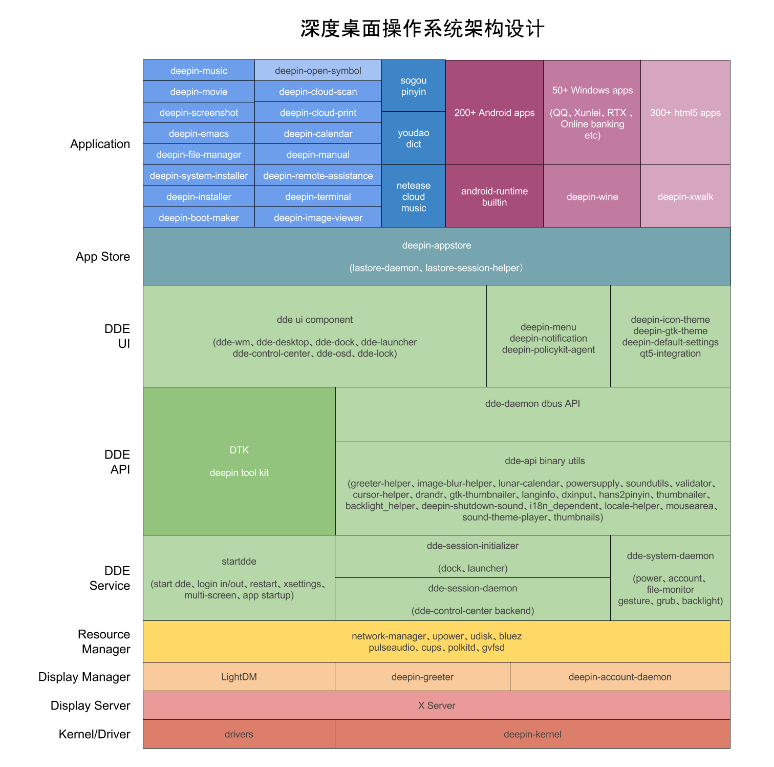 - 桌面环境: 以深度桌面环境为例,主要包括桌面环境后台服务和守护进程、桌面环境对外提供图形开发工具库、二进制工具、DBus API服务和桌面环境UI界面层几个部分组成的,后面我会详细讲每一个细节