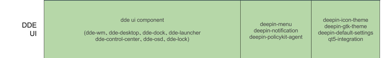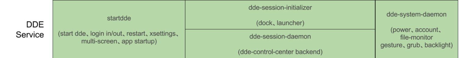 dde-sessin-initalizer、dde-session-daemon以及dde-system-daemon从功能上,相当于Gnome的gnome-session-daemon 所做的事情,只不过深度团队根据用户的需要以及很多优化加速设计,用 golang重写了整个后台守护进程的代码。可以说 DDE 和 Gnome以及KDE一样,都是调用底层的库(network-manager、upower、udisk、bluez、pluseaudio、cups、polkitd、gvfsd)对桌面环境和应用提供更为抽象和高级的服务。