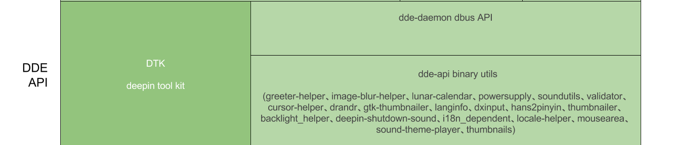 在深度桌面环境的后台守护进程基础之上,桌面环境会对外提供一个API层,包括图形开发工具库、二进制工具和DBus API接口,供桌面环境和应用程序直接调用,而不用自己重头开发,其中DBus API部分都通过DBus总线在应用调用特定的接口时动态唤醒(默认不常驻内存),任何语言编写的应用都可以轻松调用,根据上面图所示,从左到右分别进行介绍。