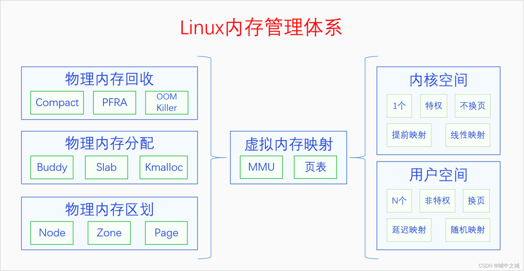 前面我们讲了这么多的东西,现在再来总结回顾一下。首先我们再重新看一下Linux的内存管理体系图,我们边看这个图边进行总结。