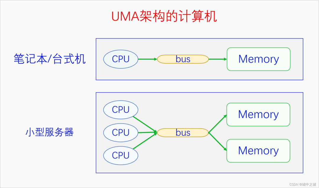 我国的省为什么要按照现在的这个形状来划分呢,主要是依据山川地形还有民俗风情等历史原因。那么物理内存划分为节点的原因是什么呢?这就要从UMA、NUMA说起了。我们用三个图来看一下。