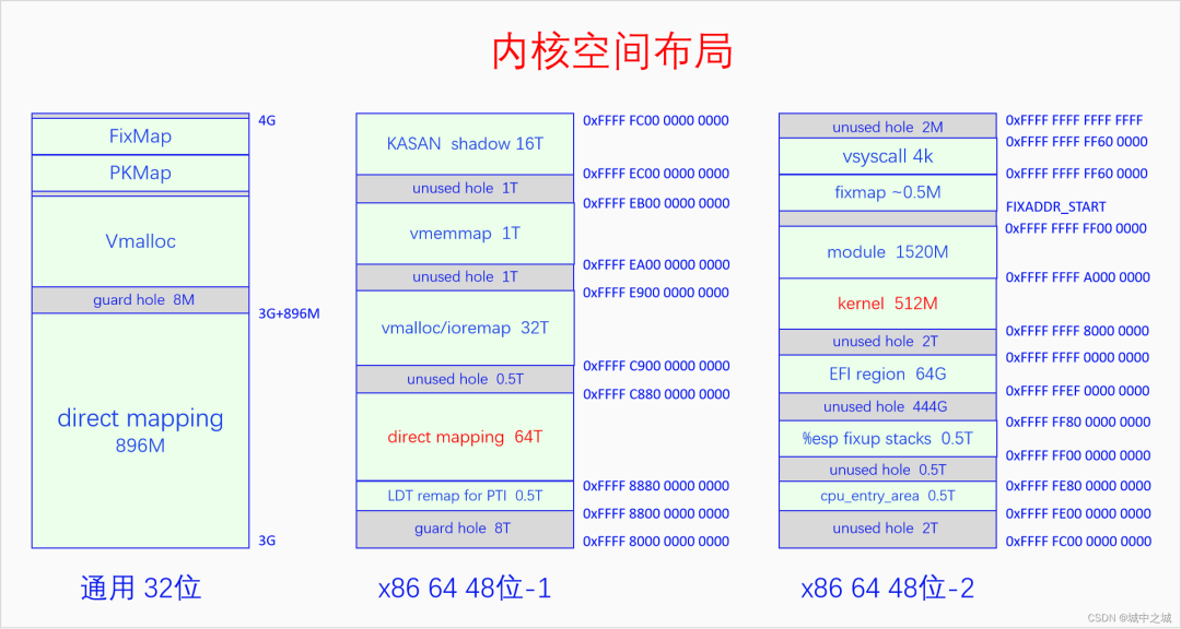 64位的内核空间布局比较复杂,而且不同的架构之间差异非常大,我们以x86 64 48位虚拟地址为例说一下。图中一列画不下,分成了两列,我们从48位-1看起,首先是由一个8T的空洞,然后是LDT remap,然后是直接映射区有64T,用来映射所有的物理内存,目前来说对于绝大部分计算机都够用了,然后是0.5T的空洞,然后是vmalloc和ioremap区有32T,然后是1T的空洞,然后是vme mmap区有1T,vmemmap就是我们前面所讲的所有页面描述符的数组,然后是1T的空洞,然后是KASAN的影子内存有16T,紧接着再看48位-2,首先是2T的空洞,然后是cpu_entry_area,然后是0.5T的空洞,然后是%esp fixup stack,然后是444G的空洞,然后是EFI的映射区域,然后是2T的空洞,然后是内核的映射区有512M,然后是ko的映射区有1520M,然后是fixmap和vsyscall,最后是2M的空洞。如果开启了kaslr,内核和映射区会增加512M,相应的ko的映射区会减少512M。