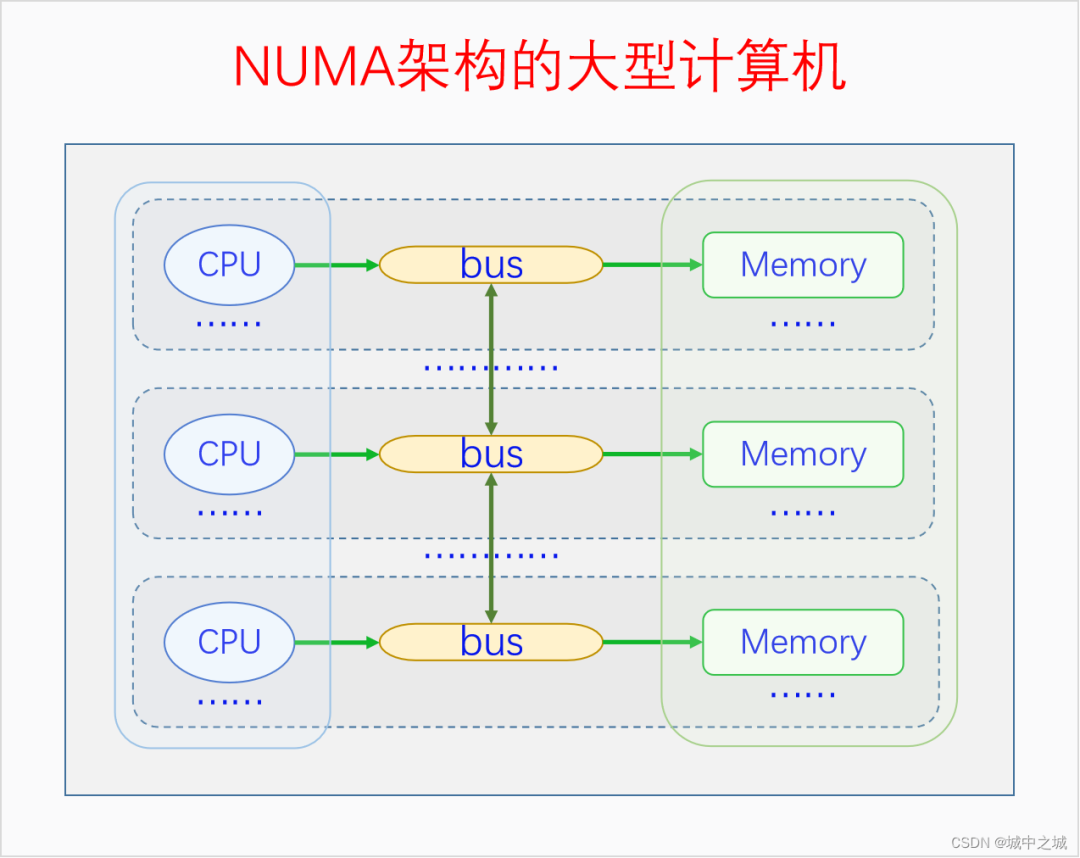 图中的CPU都是物理CPU。当一个系统中的CPU越来越多、内存越来越多的时候,内存总线就会成为一个系统的瓶颈。如果大家都还挤在同一个总线上,速度必然很慢。于是我们可以采取一种方法,把一部分CPU和一部分内存直连在一起,构成一个节点,不同节点之间CPU访问内存采用间接方式。节点内的内存访问速度就会很快,节点之间的内存访问速度虽然很慢,但是我们可以尽量减少节点之间的内存访问,这样系统总的内存访问速度就会很快。