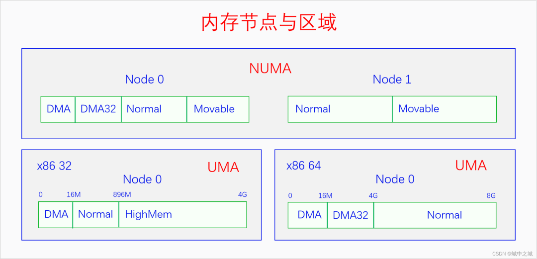 Linux中的代码对UMA和NUMA是统一处理的,因为UMA可以看成是只有一个节点的NUMA。如果编译内核时配置了CONFIG_NUMA,内核支持NUMA架构的计算机,内核中会定义节点指针数组来表示各个node。如果编译内核时没有配置CONFIG_NUMA,则内核只支持UMA架构的计算机,内核中会定义一个内存节点。这样所有其它的代码都可以统一处理了。