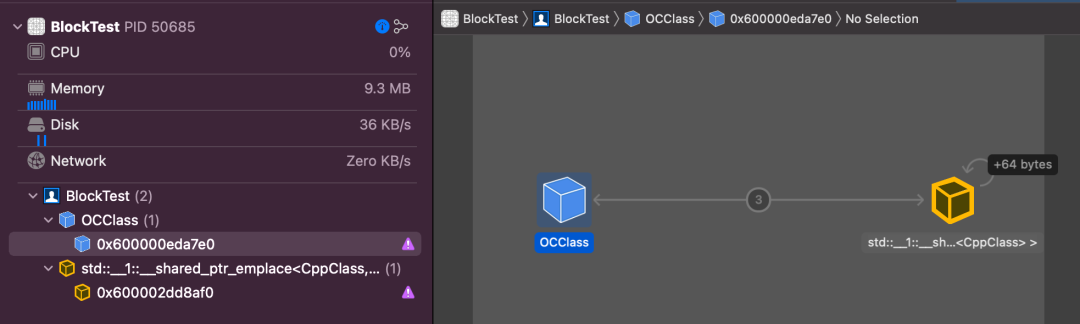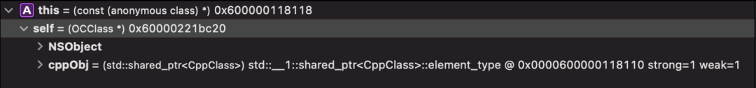 根据前面的结论,在CppClass成员函数attachOCBlock中,ocBlock直接捕获shared_from_this同样会引发循环引用,同样采取std::weak_ptr来解决。