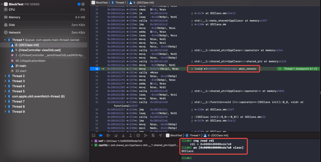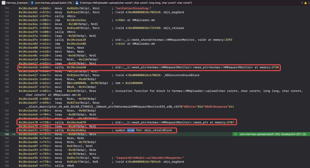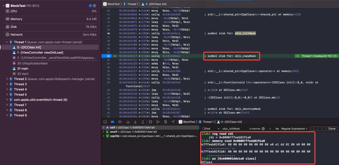 weakMinotor进行了复制,在汇编代码 142 行; Block从栈上拷贝到堆上的时候,再次对weakMinotor进行了复制,在汇编 144 行;