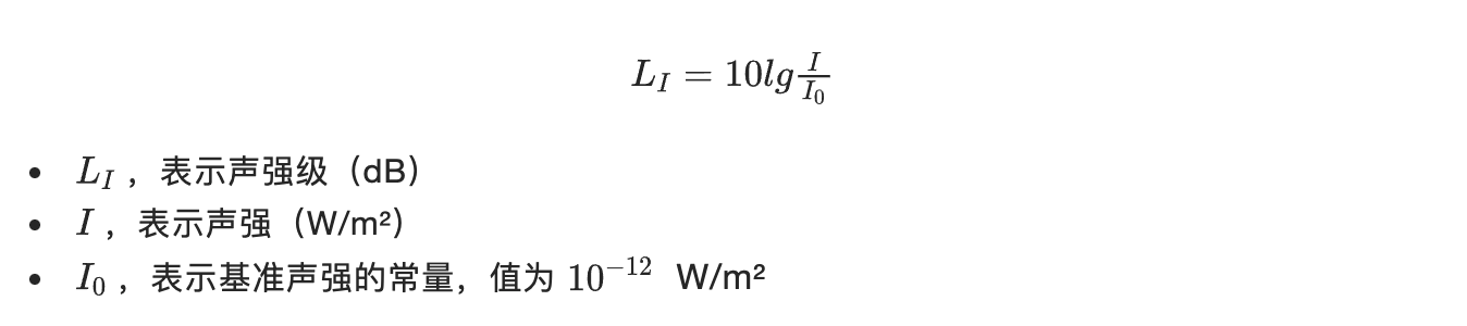 声强是单位时间内通过垂直于声波传播方向的单位面积的平均声能,用 I 表示声强。声强的单位是『瓦/平方米(W/m²)』。人耳允许的声强范围为 0.000000000001~1 W/m²,这个范围太大。此外,心理物理学的研究表明,人对声音强弱的感觉并不是与声强成正比,而是与其对数成正比的,所以我们引入『声强级』来表示声强。