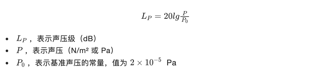声压级(Sound Pressure Level,SPL),是以 2×10-5 N/m² 为参考值,任一声压与其比值的对数乘以 20 记为声压级,单位也是『分贝(dB)』。这里为什么是 20?把上面讲到的声压与声强的关系公式带入进声强级的计算公式即可推到得出声压级的计算公式。