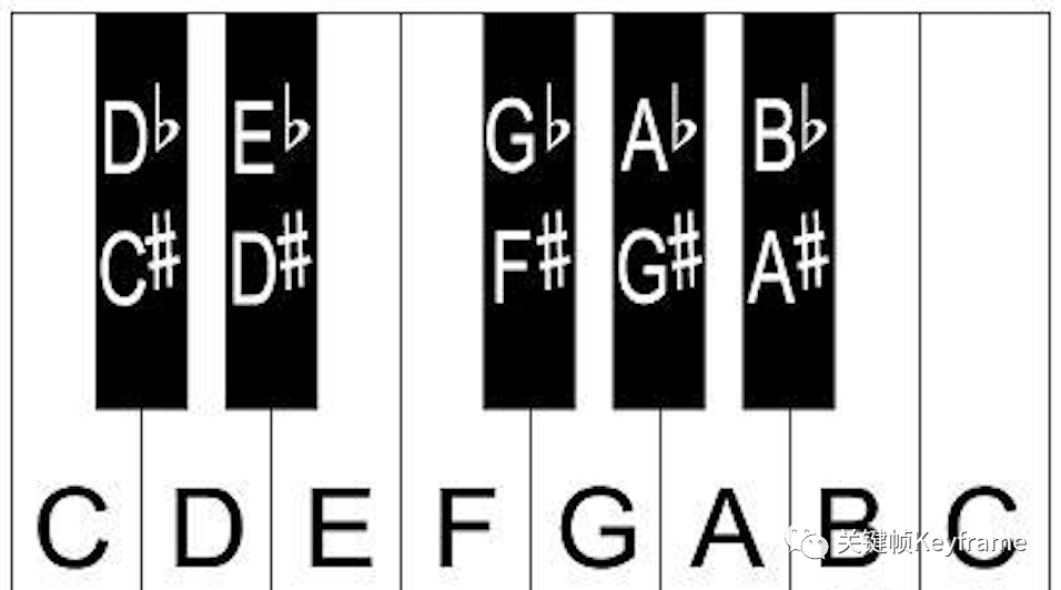 注意,7 个全音只有 5 个半音。E 和 F 之间,B 和 C 之间是没有半音的。详细来讲,就是一个八度之间有 12 个半音。其中 7 个(CDEFGAB)叫自然音,另外 5 个叫变化音。自然音之间一般是隔着两个半音(相隔两个半音可以叫距离为一个全音),也有部分自然音之间(E 和 F,B 和 C)只隔一个半音。