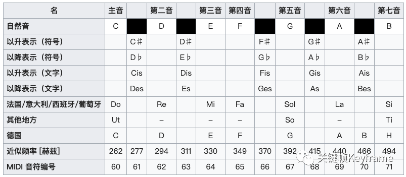 下面的图表完整的表示自 C4(中央 C)起向上八度内的半音音阶: