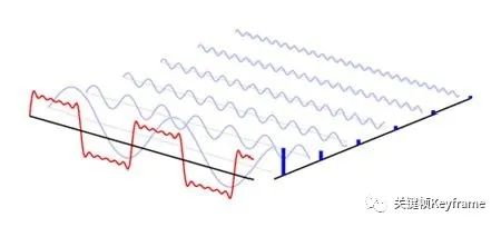 将该复合波形进行傅里叶变换,拆解还原成每个频率上单一的正弦波构成,相当于把二维的波形图往纸面方向拉伸,变成了三维的立体模型,而拉伸方向上的那根轴叫频率,现在从小到大每个频率点上都对应着一条不同幅值和相位的正弦波。