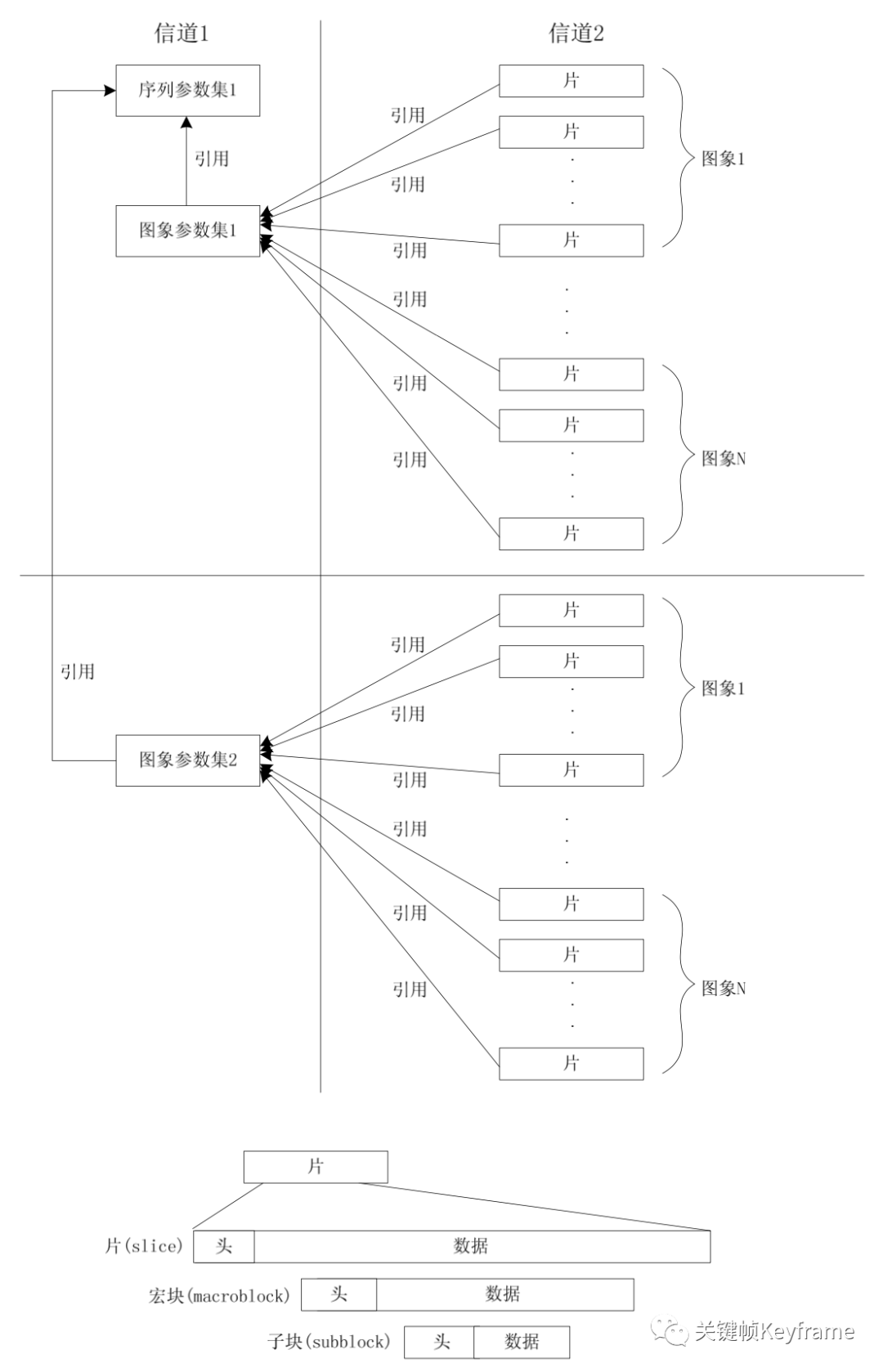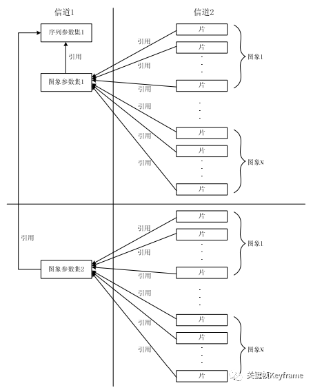 在 H.264 中,分层结构相较之前最大的不同是取消了序列层和图像层,并将原本属于序列和图像头部的大部分句法元素游离出来形成序列和图像两级参数集,其余的部分则放入片层。在这种机制下,由于参数集是独立的,可以被多次重发或者采用特殊技术加以保护。参数集与参数集外部的句法元素处于不同信道中,这是 H.264 的一个建议,我们可以使用更安全但成本更昂贵的通道来传输参数集。