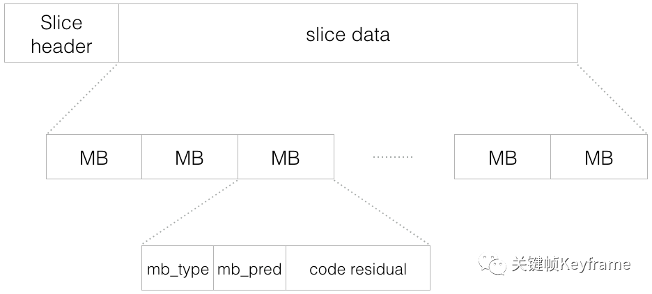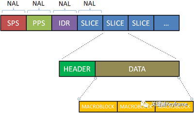 H.264 结构中,一幅视频图像编码后的数据叫做一帧,一帧由一个片(slice)或多个片组成,一个片由一个或多个宏块(MB)组成,一个宏块由 16x16 的 YUV 数据组成。宏块是 H.264 编码的基本单位。