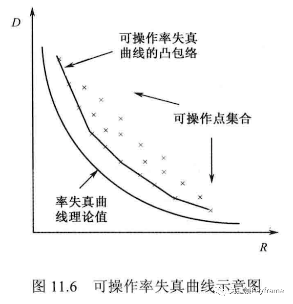 R(D) = min I(X, Y),它给出了限定失真条件下信息压缩允许的下界。但其在视频编码中难以应用,因为各种概率和条件概率未知,只能作为理论值。视频编码中的率失真曲线:为了研究视频码率与视频质量的平衡。由于系统性,不能达到理论上的 R(D) 值,只能由不同的编码参数(如 QP 和选择的模式)得到有限的 (R, D) 可操作点,形成凸包络。