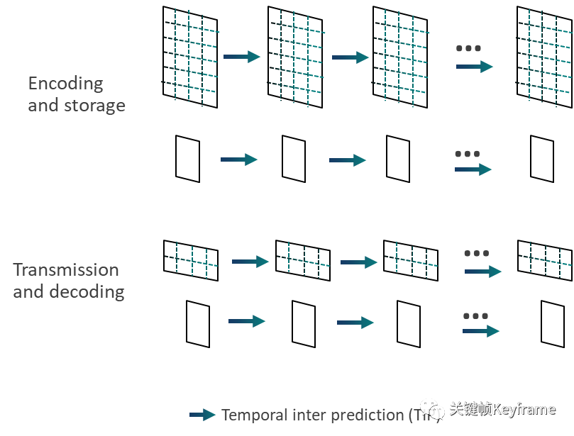 P 帧,即预测编码图像帧,利用之前的 I 帧或 P 帧,采用运动预测的方式进行帧间预测编码。