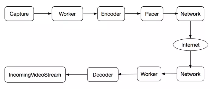 在接收端,Network线程从网络接收字节流,接着Worker线程反序列化为RTP数据包,并在VCM模块进行组帧操作。Decoder线程对组帧完成的数据帧进行解码操作,解码后的原始数据VideoFrame会推送到IncomingVideoStream线程,该线程把VideoStream投放到render进行渲染显示。至此,一帧视频数据完成从采集到显示的完整过程。