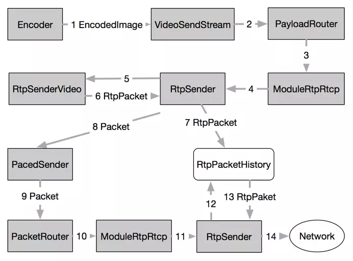 Encode线程调用编码器(比如VP8)对采集到的Raw VideoFrame进行编码,编码完成以后,其输出EncodedImage通过回调到达VideoSendStream::Encoded()函数,进而通过PayloadRouter路由到ModuleRtpRtcpImpl::SendOutgoingData()。接下来,该函数向下调用RtpSender::SendOutgoingData(),进而调用RtpSenderVideo::SendVideo()。该函数对EncodedImage进行打包,然后填充RTP头部构造RTP报文;如果配置了FEC,则进一步封装为FEC报文。最后返回RtpSender::SendToNetwork()进行下一步发送。