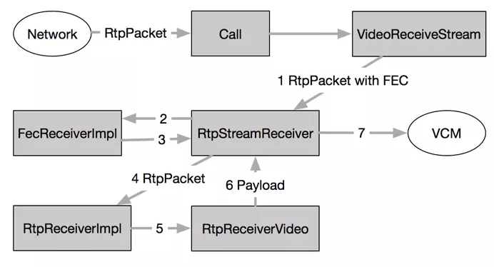 RtpStreamReceiver::ReceivePacket()首先判断数据包是否是FEC报文,如果是则调用FecReceiver进行解包,否则直接调用RtpReceiver::IncomingRtpPacket()。该函数分析RTP报文得到通用的RTP头部描述结构,然后调用RtpReceiverVideo::ParseRtpPacket()进一步得到Video相关信息和负载,接着经过回调返回RtpStreamReceiver对象。该对象把Rtp描述信息和负载发送到VCM模块,继续接下来的JitterBuffer缓存和解码渲染操作。</br>