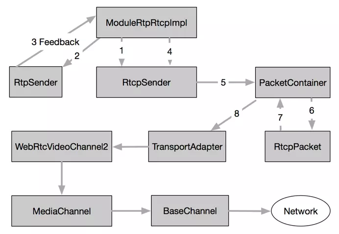 接下来每种RTCP报文都会调用各自的序列化函数,把报文序列化为网络字节流。最后通过回调到达PacketContainer::OnPacketReady(),最终把字节流发送到传输层模块:即通过TransportAdapter到达BaseChannel,Network线程调用传输层套接字API发送数据到网络。