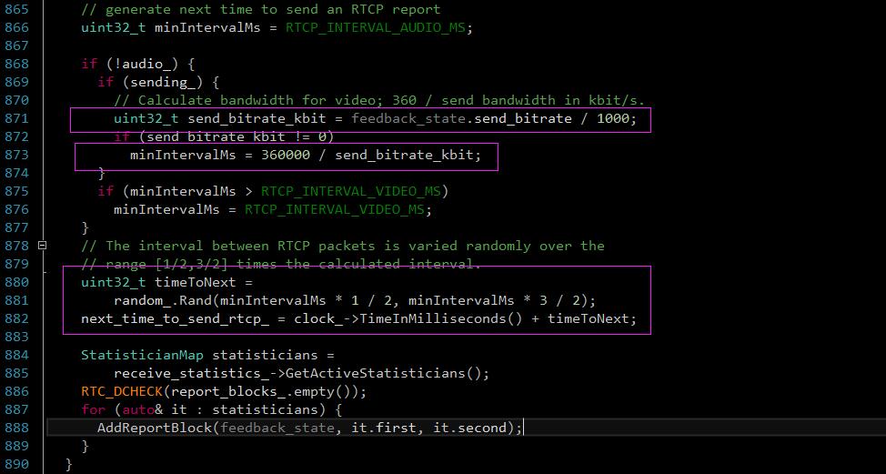 本节重点分析WebRTC内部RTCP报文的构造、发送、接收、解析、反馈等流程。需要再次强调的是,RTCP报文的数据源来自RTP报文发送和接收时的统计信息。在WebRTC内部,RTCP报文的发送采取周期性发送和及时发送相结合的策略:ModuleProcess线程周期性发送RTCP报文;而RtpSender则在每次发送RTP报文之前都判断是否需要发送RTCP报文;另外在接收端码率估计模块构造出REMB报文后,通过设置超时让ModuleProcess模块立即发送RTCP报文。