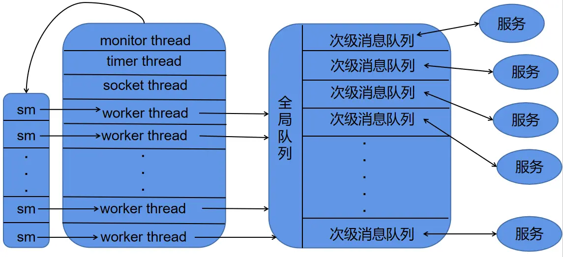 在 skynet 中,每个服务都拥有自己的一个次级消息队列。一个服务给另一个服务发送消息的过程,本质上就是将一个 skynet_message压入到目标服务的次级消息队列当中。当一个服务的次级消息队列非空时,skynet 会将其push 到全局消息队列当中。而消息的消费,则是由线程池中的worker 线程来完成,其大致的框图如下: