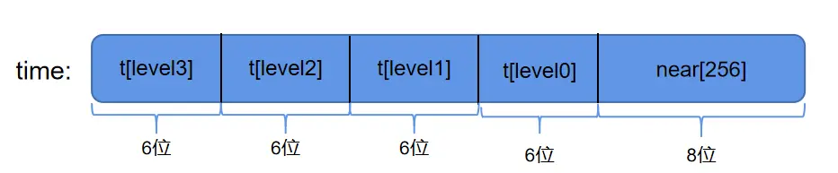 在上述代码中,可以看到每调用一次 timer_shift, time就会自增 1,而 skynet_updatetime 中一共执行了 diff 次 timer_shift。因此 time 代表了从 timer 启动后至今一共经历了多少次 tick(一次 tick 的长度为10ms)。而且从 timer_shift 函数我们可以看出time和near数组以及t数组关系: