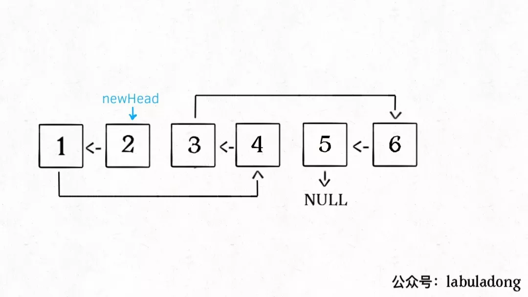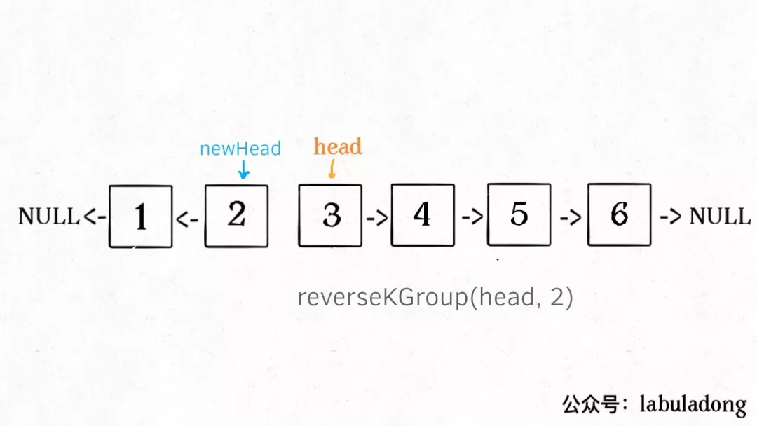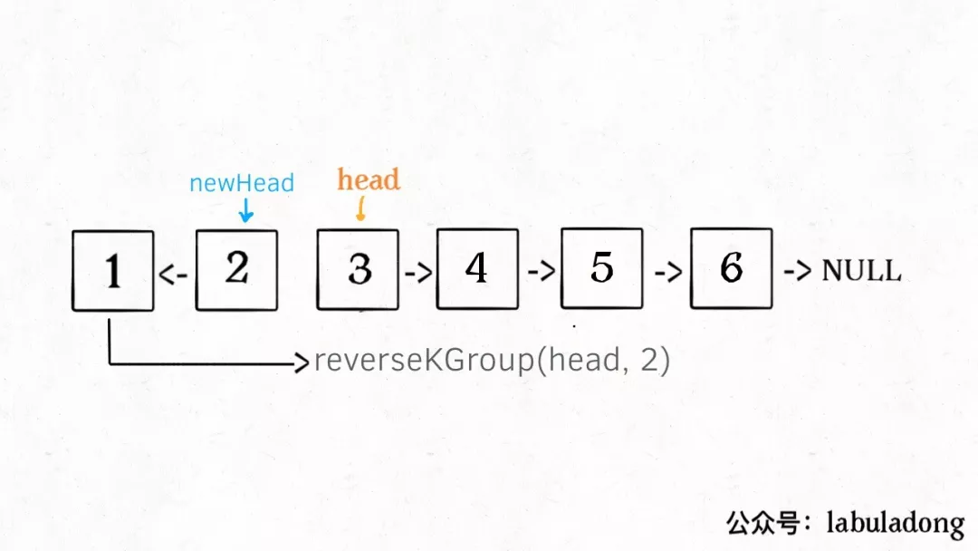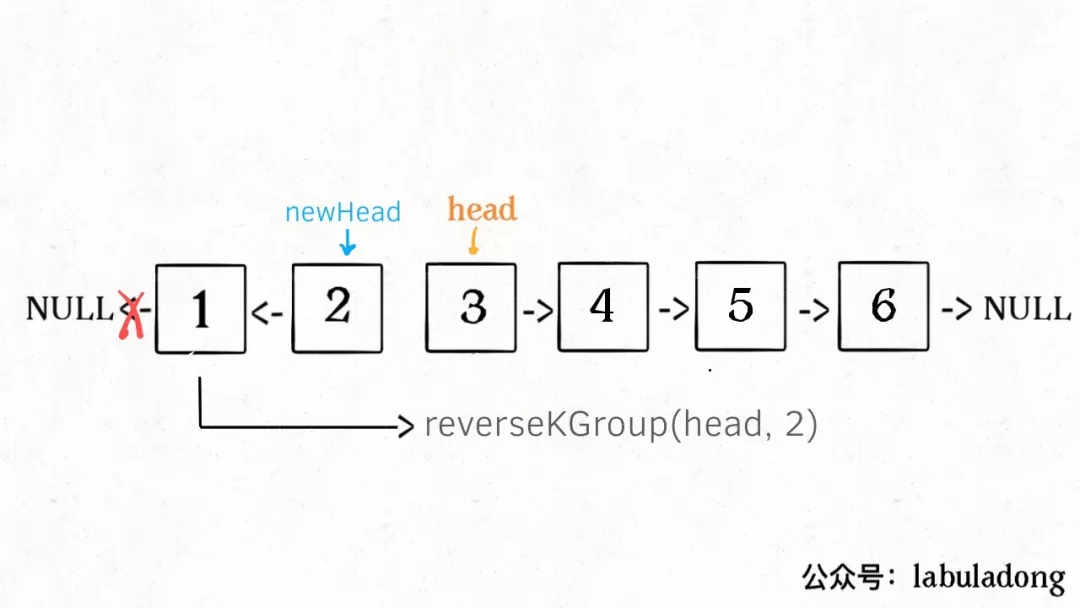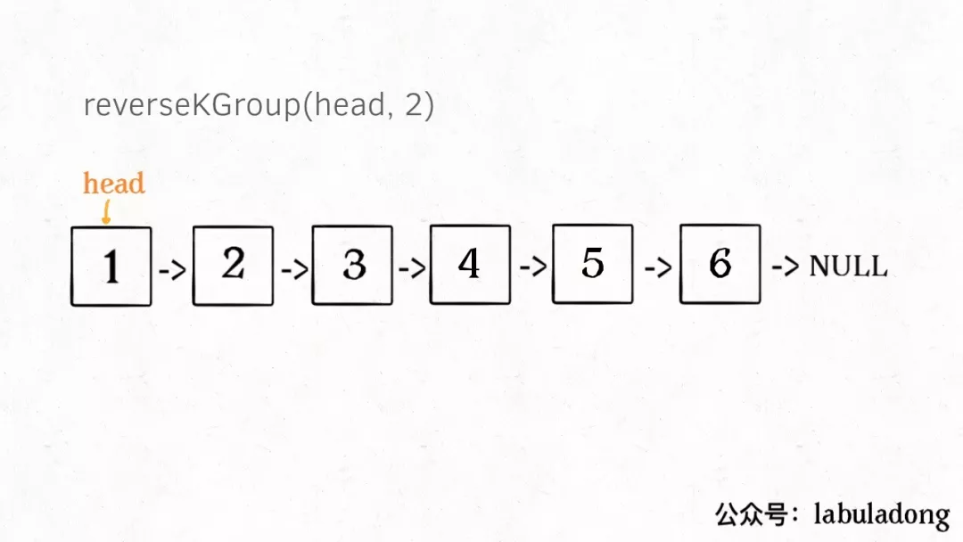 什么叫递归性质?直接上图理解,比如说我们对这个链表调用 revereKGroup(head, 2),即以 2 个节点为一组反转链表: