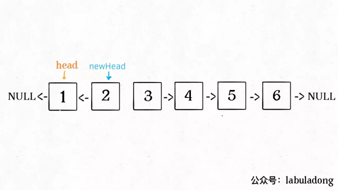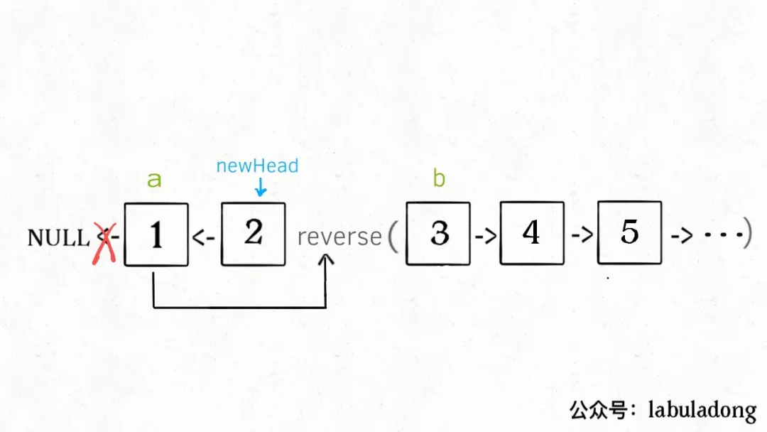按照定义,这个reverse(head.next)执行完成后,整个链表应该变成了这样: