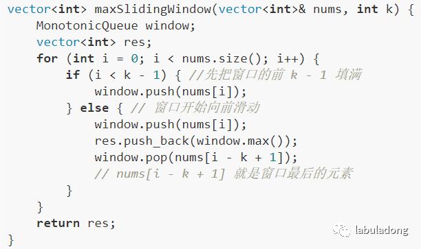 当然,这几个 API 的实现方法肯定跟一般的 Queue 不一样,不过我们暂且不管,而且认为这几个操作的时间复杂度都是O(1),先把这道「滑动窗口」问题的解答框架搭出来: