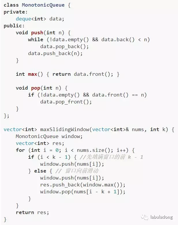回到这道题的场景,窗口向前滑动的时候,要添加一个数同时减少一个数,所以想在 O(1) 的时间得出新的最值,就需要「单调队列」这种特殊的数据结构来辅助了。