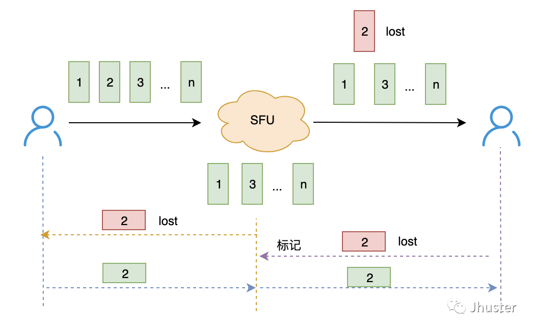 SFU 作为客户端上行的接收端,发现丢包也跟普通的接收端一样,定时主动地向源头发送 NACK 请求;反过来,SFU 作为客户端下行的发送端,收到 NACK 请求后,如果发现不在 cached list,则标记一下,一旦收到源头的重传,则第一时间转发到下行。