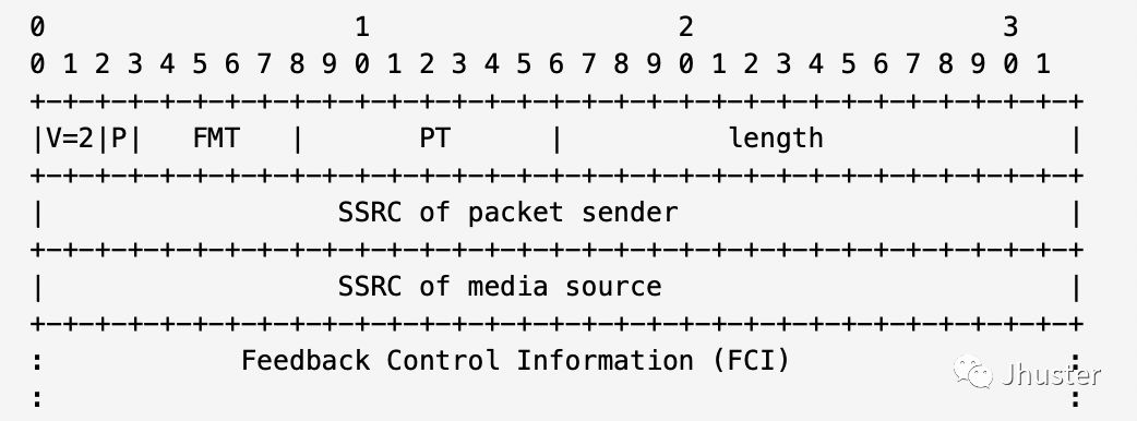 RTCP 的反馈报文包头定义如下,FMT 和 PT 决定了该报文的类型,FCI 则是该类型报文的具体负载: