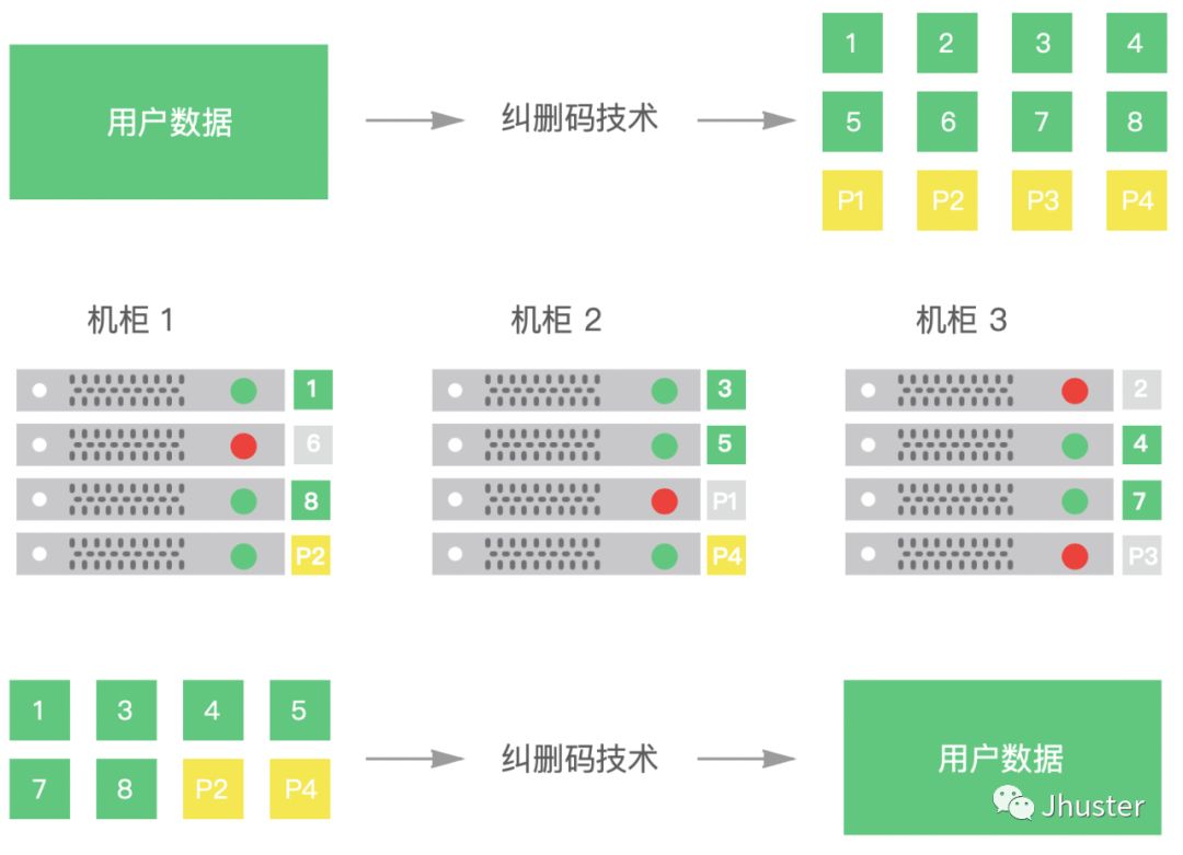 图中采用的是 8+4 的纠删码策略(即:原始数据切割为 8 份,计算出 4 份冗余信息),将这 12 份分别存储在 不同机柜的 12 台不同节点上,即使同一时刻出现多台节点(至多 4 台)损坏或不可访问,只要有不少于 8 个节点可用,数据即可恢复。