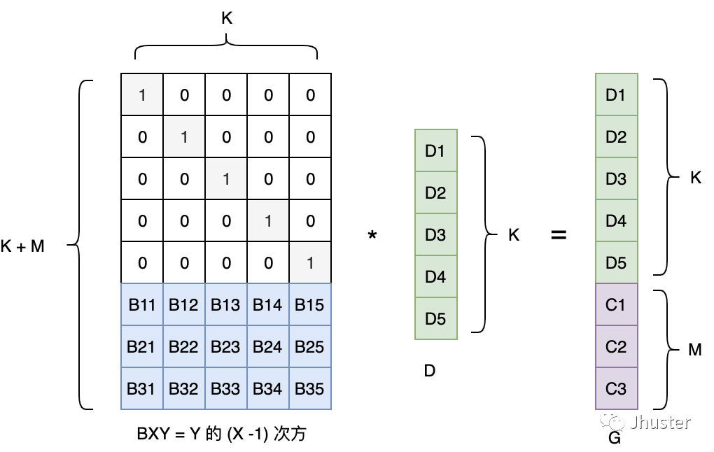 - 生成一个变换矩阵 B:由一个 K 阶的单位矩阵 和一个 K * M 的范德蒙特 矩阵(Vandemode)组成