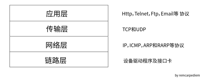 TCP/IP协议是一组网络传输协议的集合,按照网络模型的不同层次,使用不同的传输协议进行分工合作。TCP/IP的网络参考模型一共有四层,自上而下分别为应用层,传输层,网络层和数据链路层。